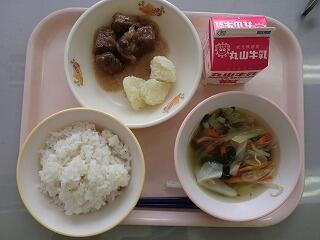 麦ご飯・野菜スープ・和風サイコロステーキ・粉ふきいも 703kcal