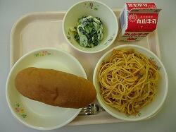 パン・ミートビーンズスパゲティ・ほうれん草サラダ