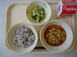 今日のポークビーンズには、大豆と青まめ(枝豆)が