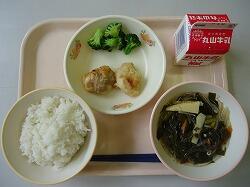 麦ご飯・五目スープ・鶏の唐揚げ・ブロッコリー