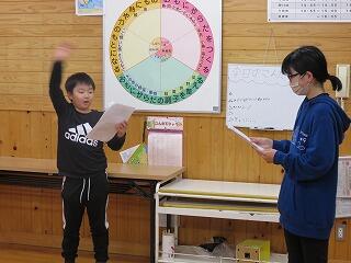 地域の方に方言指導の先生として来ていただきました。ちなみに、このクラスの子のおじいさまとおばあさまです。なので、なんだか照れちゃう瞬間も。