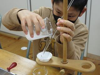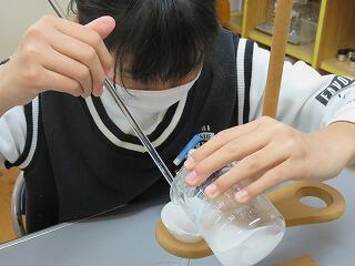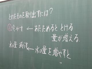 子ども達の手元のビーカーにはすでに真っ白な結晶ができています。溶けていたものが出てきているのです。
