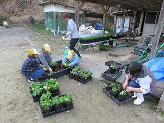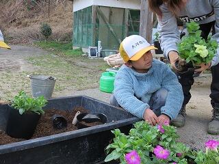 用務の先生と一緒に、1・2年生がペチュニアの苗植えをしていました。