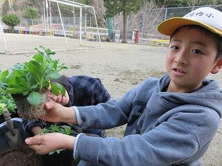 苗の根をほぐしてから植えます。用務の先生に教えてもらいました。