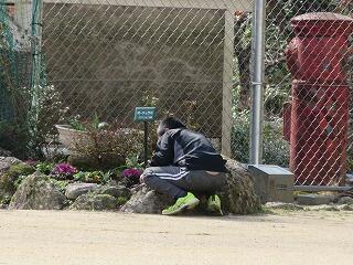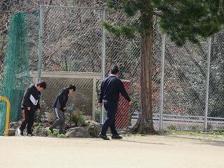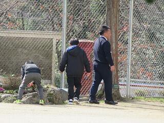 こちらでは、用務の先生が、卒業式で使う花の手入れをしていました。たくさん咲きそろってきました。