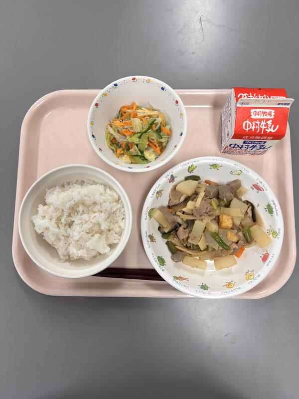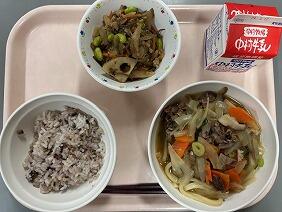 十六穀ごはんは雑穀の食感がよく、プチプチしていて楽しみながら食べられました。きんぴらは、レンコンやごぼうがたっぷり入っていて、食物繊維が豊富に取れました。肉うどんは、1年生と5年生のリクエスト献立です。肉のうま味がスープと野菜に染みていて、うどんもコシがあっておいしかったです。大満足の献立でした。