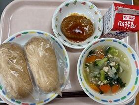 今日は、子どもたちの大好きなメニューが盛りだくさんです!まずは6年生のリクエスト、揚げパン!年に1度のお楽しみです。食べやすいように、小さいパン2個を油で揚げて、砂糖ときな粉をまぶしてあります。一口かじると、ふわふわのパンときな粉と砂糖の甘さが口いっぱいに広がります。なんと3本食べている人もいました。(先生は4本も!)口の周りにきな粉をつけて、笑顔でほおばります。次に4年生のリクエスト、コンソメスープ!今回は冬野菜と鶏肉がたっぷり入った食べ応えのあるスープです。優しい味で、ほっこりします。ケチャップハンバーグは柔らかく、これまた2枚食べている児童もいてペロリでした。お客さんも大満足の豪華な給食でした。
