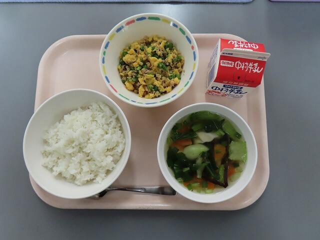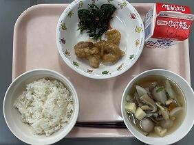 添え野菜はキャベツとキュウリで、ほどよい歯ごたえと塩気でさっぱりと食べられました。五目スープは具だくさんで、もやしやこんにゃく寒天など様々な食感が楽しめました。鶏の唐揚げは、3年生と4年生の児童のリクエストです。毎年リクエストに入っているほど、人気です。カラッと揚がっていて、鶏にもしっかり味が付いていたので、ごはんとよく合いました。ほどんどの児童が大事に取っておいて、最後においしそうに食べていました。(私もそうしました。)