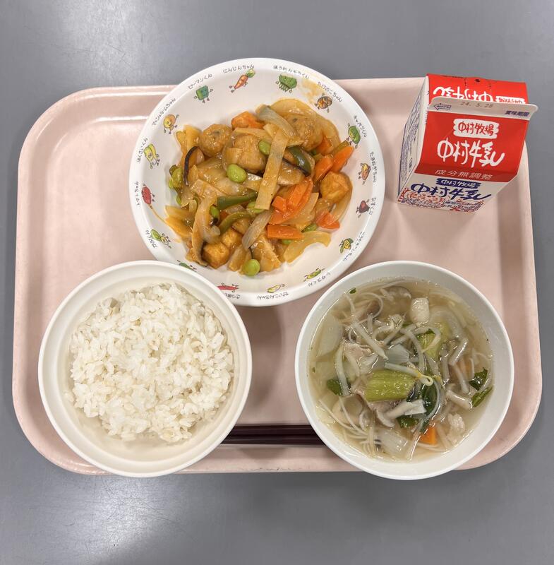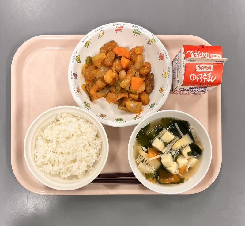 酢豚にはパイナップルが入っているものもありますが、学校の酢豚には入っていません!それでも甘味と酸味のある酢豚で、子ども達もパクパク食べていました。