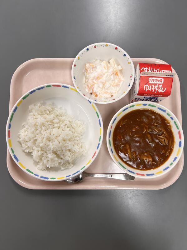 今日はみんなの大好きなポークカレーです。大河内小のカレーには、ひきわり大豆が入っていることが多く、食べ応えがあります。たっぷりつがれたカレーを見て、満面の笑顔の子どもたち。根菜サラダも、ごぼうやレンコンがシャキシャキしていておいしかったです。