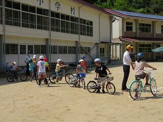 ずらりとならんだ自転車。お家の方々が持ってきてくださいました。高学年と低学年が並ぶと、やっぱりずいぶんと大きさの差がありますね。
