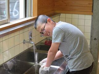 排水口のトラップの部品を、タワシや歯ブラシを使って掃除していました。「こんなところまで撮るんですか。」と、笑顔というか苦笑い。