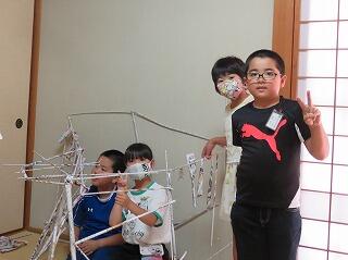 「こんな飾りもできたんですよ!」と順番を待っている子たち。それって飾りというよりお面ですよね。