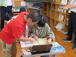 先生が5年生と学習をしている間、6年生は自分たちで学習を進めます。2人で地図帳の地名探しをした後は、タブレットパソコンで、AIが採点してくれるドリル学習に取り組みました。手書きした文字をAIが認識して採点してくれます。時代は進んでいますね!