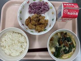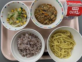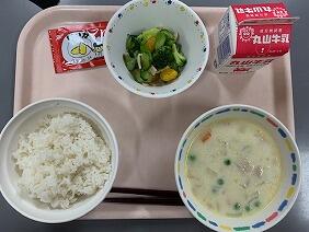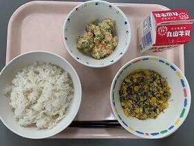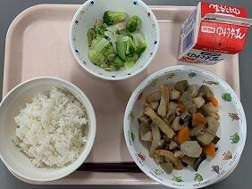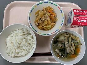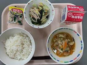 2学期最初の給食です。グリーンサラダは塩コショウが効いていて、さっぱりと食べられました。鶏肉のうま煮は、鶏肉と野菜のうま味が具材によく染みていて、ご飯に合います。「やっぱり給食はおいしいね~」と言いながら、笑顔で完食した子どもたちでした。