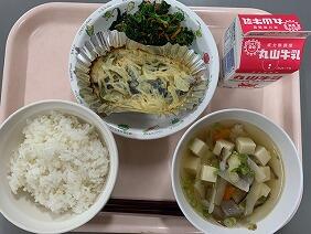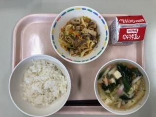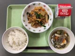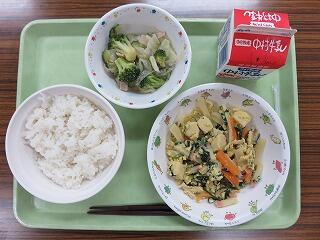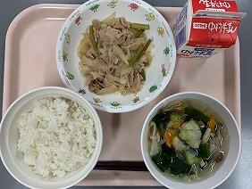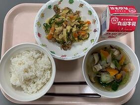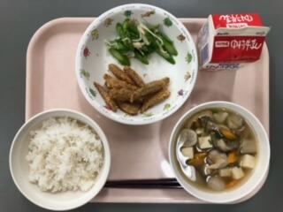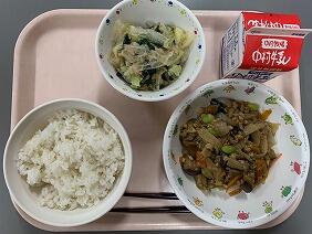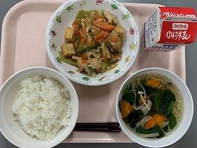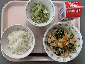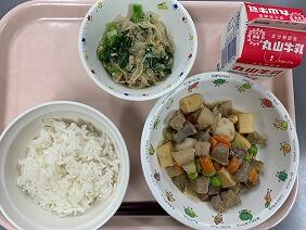 厚揚げの甘辛炒めは、にんにくの芽が入っていてパンチのきいた味でした。厚揚げが小さくてコロコロしていたので、子どもたちも食べやすかったようです。さつま汁にはさつまいもが入っていて、甘くておいしかったです。