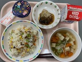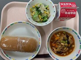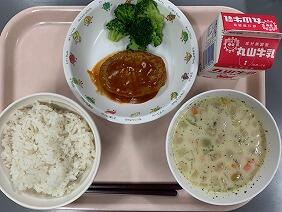 トマトソースハンバーグは、子どもたちからリクエストがあるくらい大人気のメニューです。やわらかく、トマトケチャップ味がごはんとよく合います。いつもはおかわりしない児童もおかわりして、喜んで食べていました。コーンスープは具だくさんで、スープにはクリームコーンも使われているので濃厚な味わいでした。