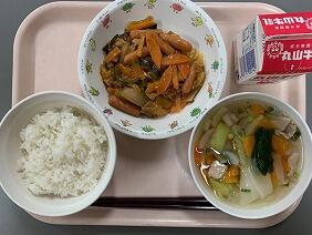 今日は子どもたちに人気のメニューの一つ、キムタク丼でした。キムチやたくあん、豚などを小さく刻んで炒め、ごはんにかけていただきます。たくあんの食感が楽しく、ピリ辛で食が進みます。いももち汁は和風の味付けで、いももちがモチモチしていて、子どもたちも大満足でした。