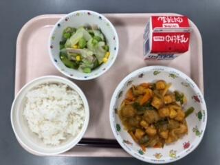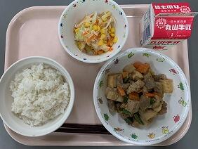 今日はおからを洋風に牛乳とチーズで煮た、ミルクおからです。おからになじみの少ない子どもたちも、ミルクおからならおいしくいただけます。豚ミンチの食感やチーズのコクがたまりません。三色どんぶりの具は、コーン、いんげん豆、鶏ひき肉です。甘辛く煮てあり、ご飯が進みました。