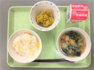コーンの甘みもあって、子どもたちはごはんをもりもりと食べていました。かぼちゃサラダはよく冷えていて、晴れて気温の上がった今日にぴったりでした。スープは、肉団子としいたけの両方のだしがよく効いていました。