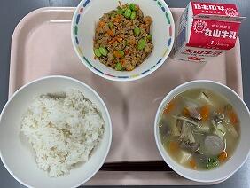 椎茸そぼろ丼は、鶏そぼろがパラパラでご飯によく混ざります。椎茸は細かく刻んであり、出汁がよく出ていました。枝豆の食感も楽しく、ごはんがパクパク進みました。けんちん汁は、里芋がゴロッと入っていて、具材は種類も量もたっぷりで、食べ応えがありました。おいしい給食を食べて、5時間目のプールも頑張れました。
