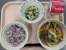 ほうれん草のサラダには、キャベツやレンコンも入っていて食感が楽しめました。肉うどんは、牛肉が贅沢に使われていて、牛の出汁と甘めの汁がよく合っていておいしかったです。ゆかりごはんはほどよい酸味でさっぱりしていて、子どもたちはうどんの汁と交互においしそうに食べていました。