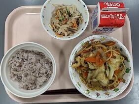 今日は月に1度のパンの日です。ふわっともっちりしていて、スパゲティとよく合います。ごぼうサラダはマヨネーズ味で、ごぼうの食感が活きていました。ナポリタンスパゲティは味にコクがあり、ウスターソースの酸味がちょうどよかったです。