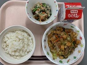 わかめごはんは塩気が効いていて、おいしかったです。おにぎりにして食べたい味でした。ゴーヤチャンプルーは、ゴーヤの苦みが出ないように薄くスライスしたり、工夫した味付けをしてあったり、調理員さんの工夫のおかげで子どもたちもおいしそうに食べていました。豆腐のふわふわともやしなどのシャキシャキがよく合います。フルーツ和えは、冷たくて甘くて夏にピッタリでした。