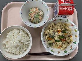 ハムサラダは、こんにゃく寒天とコリコリした歯ごたえとごま油の風味が効いていて、チョレギサラダのようで食が進みました。卵とじの高野豆腐はやさしい味のだしをよく吸っていて、子どもたちも満足顔で食べていました。