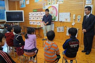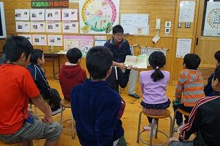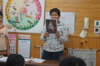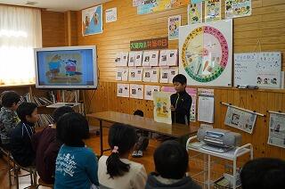 子どもたちが見やすいように挿絵をスクリーンに映しての