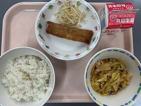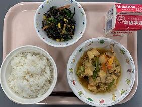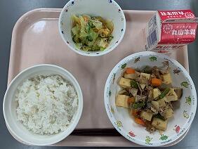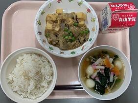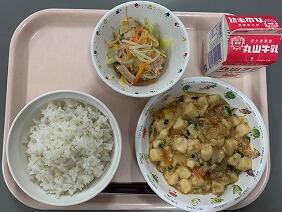 今日は中華風のメニューです。ハムの中華和えはごま油の風味がよく、もやしやキャベツがシャキシャキしていてとてもおいしかったです。マーボー豆腐は優しい味で、豆腐が小さく柔らかい物を使っているので箸でも食べやすかったです。辛みはほとんどなく、低学年の児童もおいしそうに食べていました。