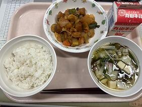 今日は久しぶりの酢豚です。豚肉にしっかりした味がつけてあり、甘めのケチャップ味とよく合います。玉ねぎやピーマンがシャキシャキしていて、食感も楽しめました。にんにくが効いていて食欲をそそりました。もずくスープは優しい味付けで、もずくのとろみでスープが飲みやすかったです。2時間寒い中で体育をした後だったので、体に染みわたりました。