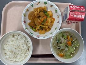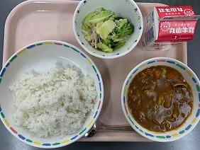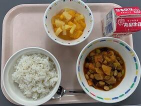 今日は新1年生の初めての給食です。チキンカレーはコクがあり、じゃがいもが大きく食べ応えがありました。ごはんにかけてあっという間にたいらげました。フルーツミックスは甘くて、デザートにピッタリでした。1・2年生の教室では、「おいしいね」と言いながらみんな笑顔で給食を楽しんでいました。