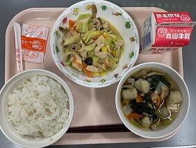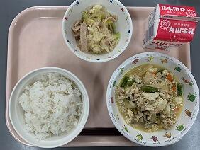 肉団子には根菜が刻んで練り込んであり、野菜の食感も楽しめました。子どもが大好きなケチャップ味で、野菜が苦手な児童も食べやすそうでした。チンゲン菜のスープにはビーフンも入っていて食べ応えがありました。