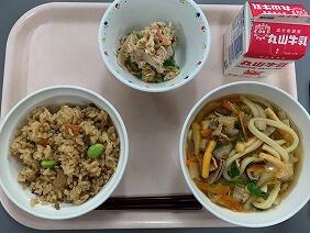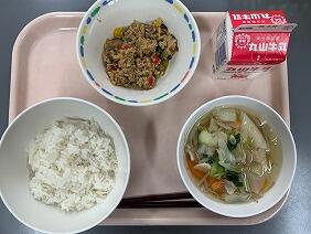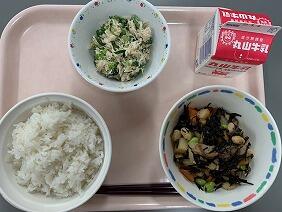 鶏ささみのサラダは、ささみが細かくほぐしてあり、ドレッシングとよく絡んでおいしかったです。ささみとブロッコリーのたんぱく質が体に染みた気がします。大豆の磯煮は程いよい味付けで、ひじきや糸こんにゃくの食感も楽しめました。大豆だけ先に探して器用に食べている児童が何人かいました。(大好きだから先に食べたいのだそうです。)