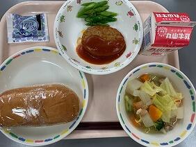 今日はリクエスト献立のケチャップハンバーグです。子どもが大好きなケチャップ味で、おかわりも大人気でした。コンソメ煮は具材が大きく切ってあり、食べ応えがありました。優しい味付けで体が温まります。ブルーベリージャムはさっぱりしていて甘くて、パンがデザートのようでした。(他のおかずを食べるのを忘れてパンばかり食べている児童も数名いました。)