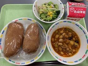 ポークビーンズは、様々な種類の豆が入っていていろいろな風味と食感を楽しめました。味付けに深みがあり、子どもでも食べやすかったです。ブロッコリーサラダはさっぱりしていて、箸が進みます。今日はリクエスト献立ということで、子どもたちの大好きな揚げパンでした。(なんと一人2個!)ふわふわのパンに甘じょっぱいきな粉がまぶしてあり、一口ごとに口の中に幸せが広がります。口の周りは粉だらけですが、みんな笑顔でした。