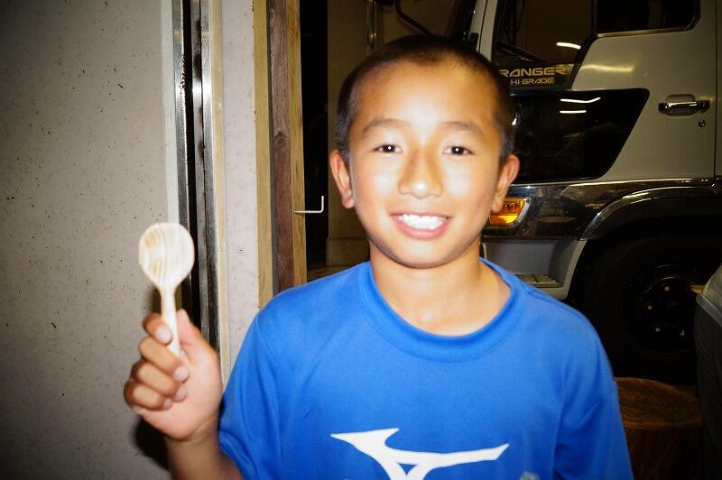 演習林施設に到着したら、休憩をして、次の活動です。今回は、木材を加工してさじ(スプーン)を作るのにチャレンジしました。
