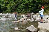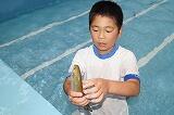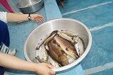 でも、みんなで協力してぜ~んぶ捕まえました。・・・そして、捕まえたニジマスは・・・楽しみの前に、学校前の一ツ瀬川で魚釣り。