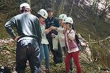 演習林での登山は、今年は通称「郵便歩道」を峠から下りるコースでした。演習林の方に迎えに来ていただき、峠まで車で移動した後、安全のためにヘルメット着用でスタート。