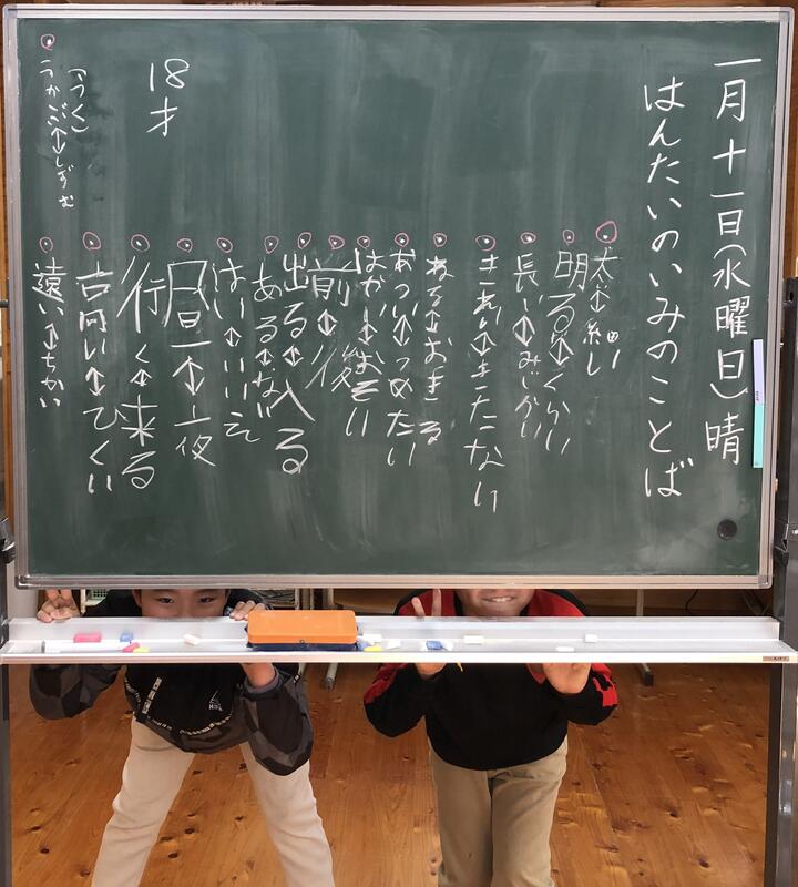 「(反対の意味の言葉を)1組見つければ4才、2組見つければ5才、3組見つければ6才、4組見つければ7才で1年生、というところかなあ。2年生で8才の君たちは5組は見つけないとねえ。見つけられますか~?」と、先生にあおられた2年生。