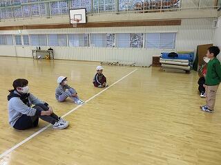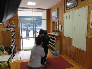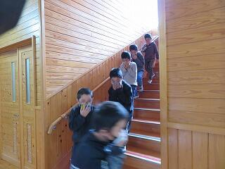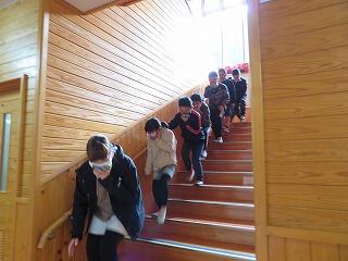 口に布を当て、背を低くして、運動場へ。運動場に出たら小走りで移動します。緊張感をもった行動ができていました。立派です。