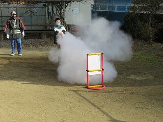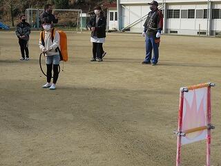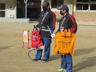 消防団の方々の指導を受けながら、消火体験をしました。5・6年は消火器。
