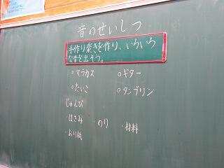 3年生。ティッシュボックスにゴムを張って、音を鳴らす実験。ゴムの長さやはじき方で音の高さが変わります。なぜでしょう?