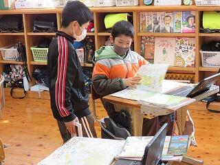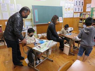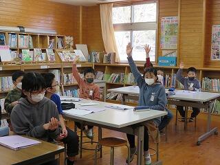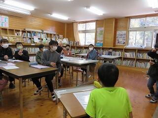 3・4年生には地域支援員の方。村の図書館から、子どもたちが興味を持ちそうな本をたくさん用意してくださいました。