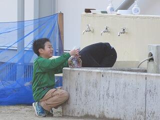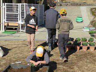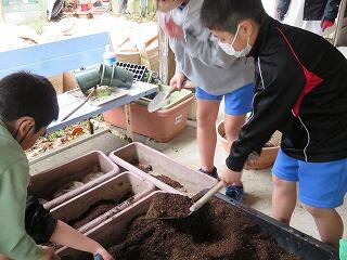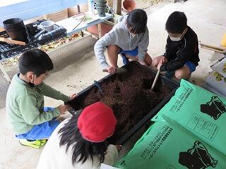 昼休み後の「ボランティアタイム」の時間。花を育てるための土づくりです。