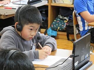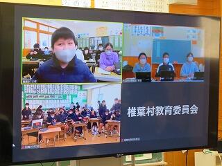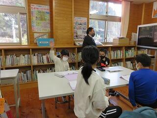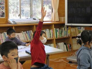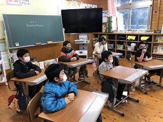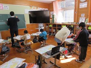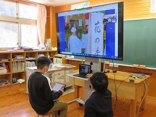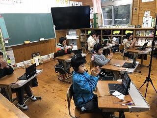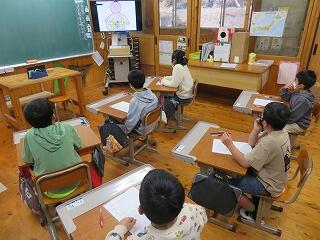 松尾小学校の先生が、大河内小学校と松尾小学校の「5年生」の授業をしています。急なパソコントラブルなどに対応するために、校長先生は見守っているだけです。