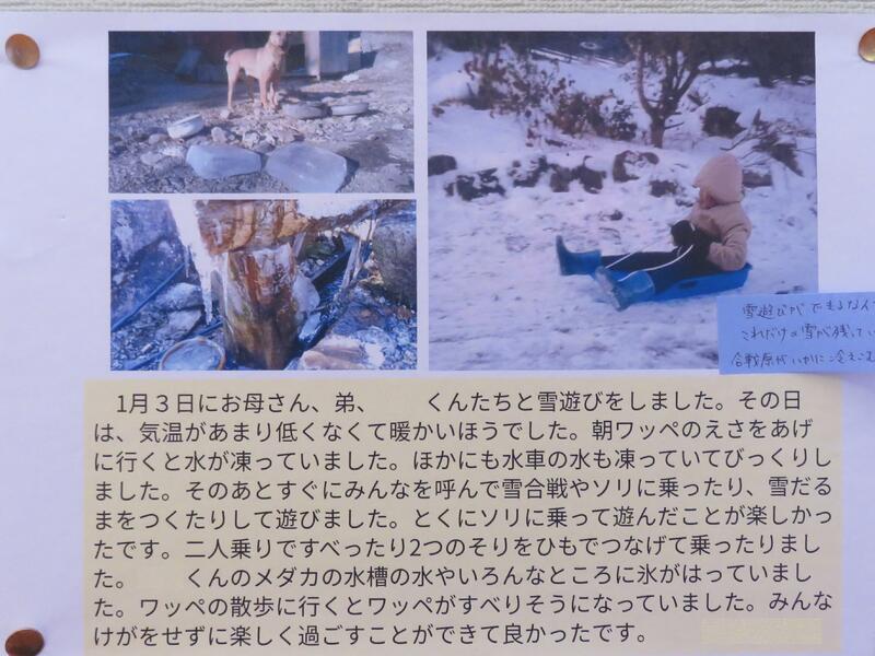 自宅に持ち帰ったタブレットパソコン使って、子どもが自分で写真を撮り、パソコンで文章を書いてまとめています。しかも、それを冬休みの間にインターネット通信で先生に提出したそうです。時代は進んでいますね。いくつか紹介します。(文章中の個人名は消しています)