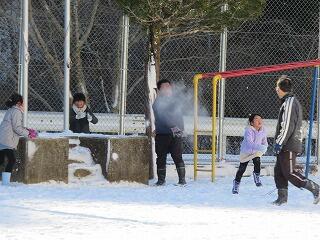 だんだんと雪玉を投げ合う雪合戦に。雪がサラサラなので、雪玉がすぐに粉雪なって舞います。傘で防ごうとするも、あちこちから玉が飛んできて黒い服がまっ白になる先生も。