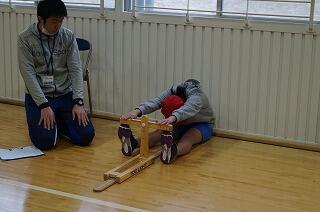 写真ではそう見えませんが、雨が降っていました。ですので、体育館裏の軒下で作業をしています。